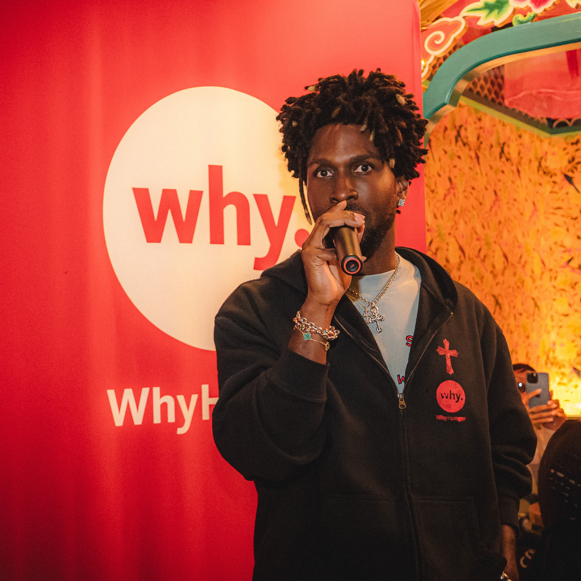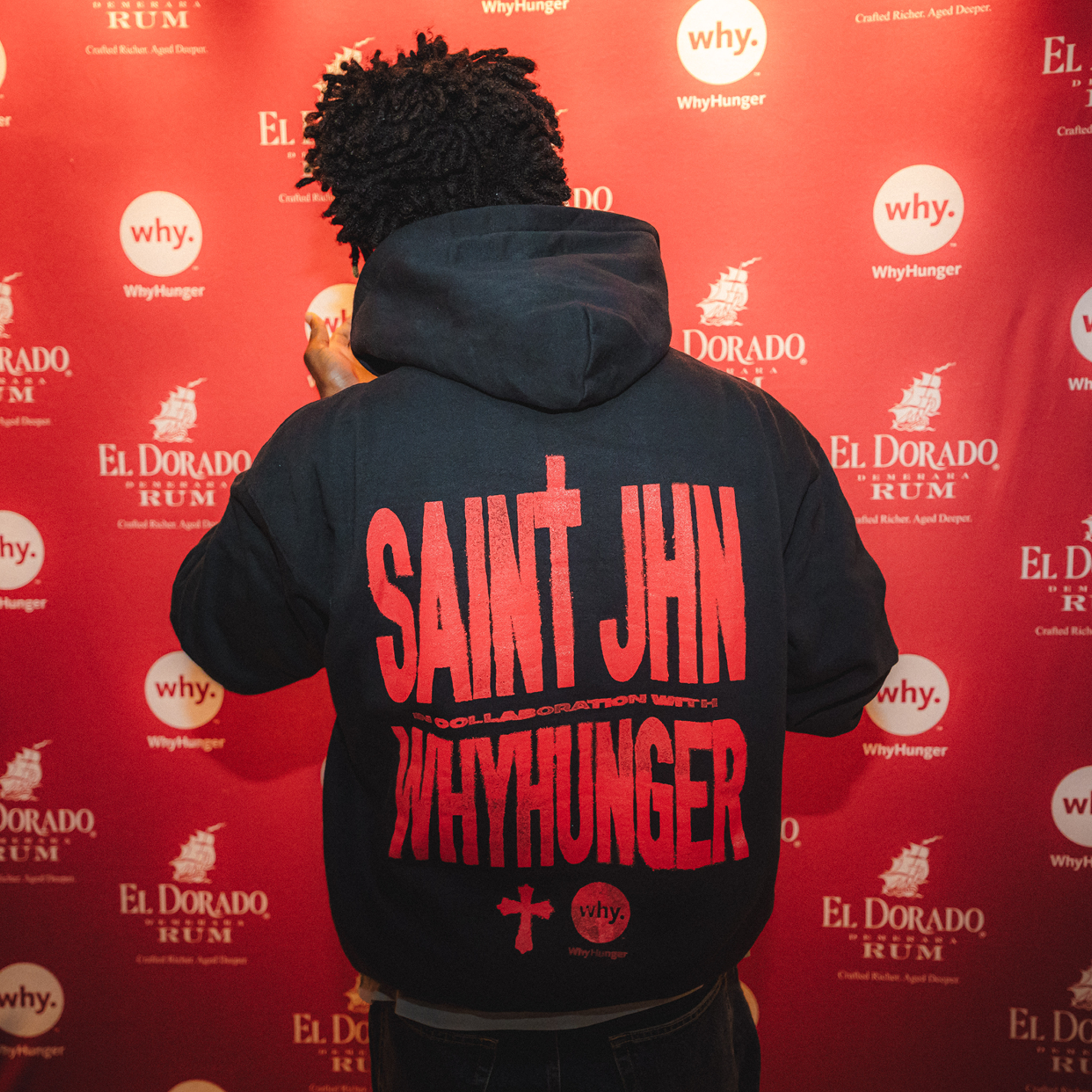 This black zip-up hoodie showcases a unique collaboration with SAINt JHN and WhyHunger. The front features the WhyHunger logo alongside SAINt JHN's signature cross in a striking red on the left side. The back highlights "SAINt JHN in collaboration with WhyHunger," complemented by the logos. Show your support of SAINt JHN's solidarity with food justice.