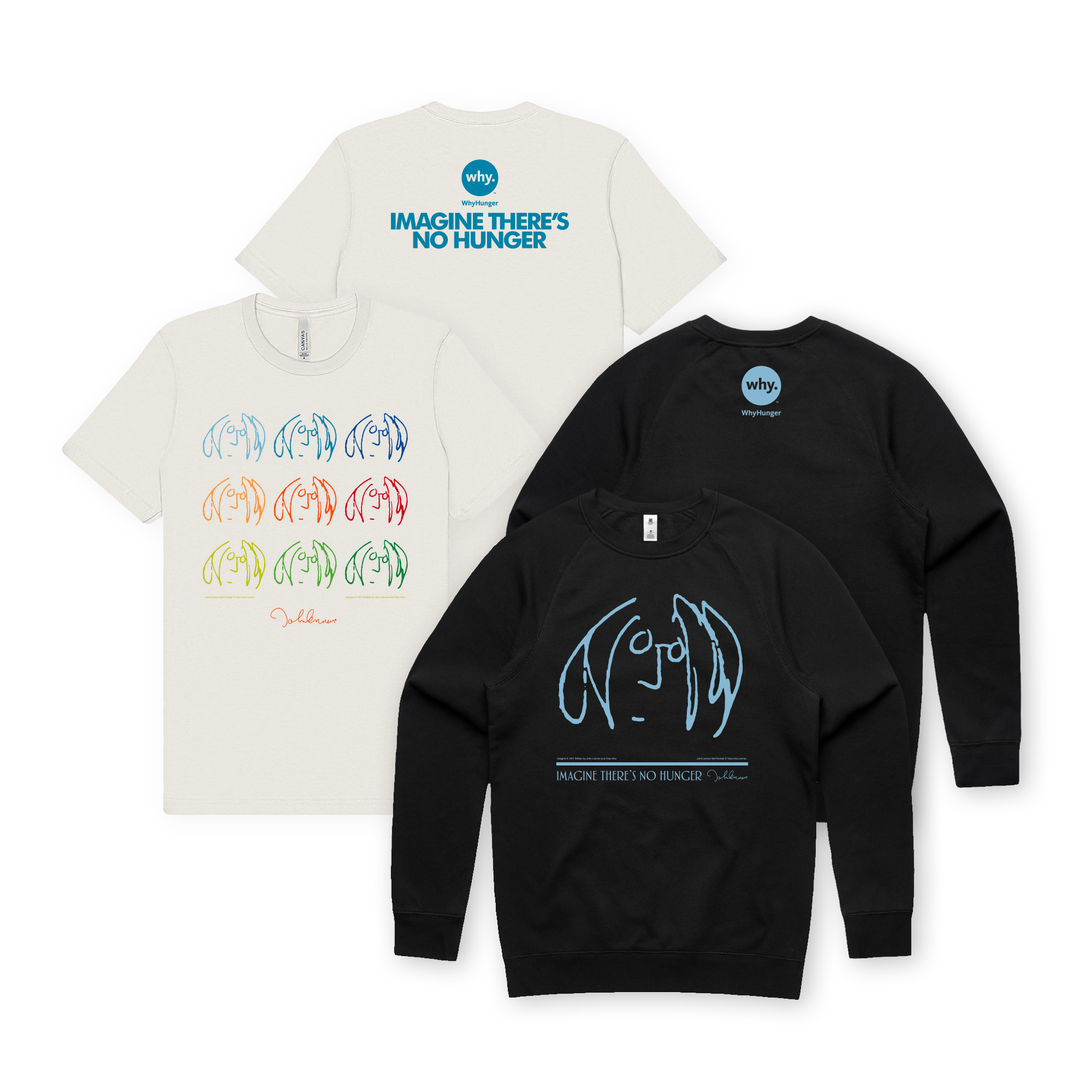 • John Lennon Imagine There's No Hunger Tee: Featuring a vibrant array of Lennon's famous self-portrait doodle and the inspirational phrase Imagine There's No Hunger.